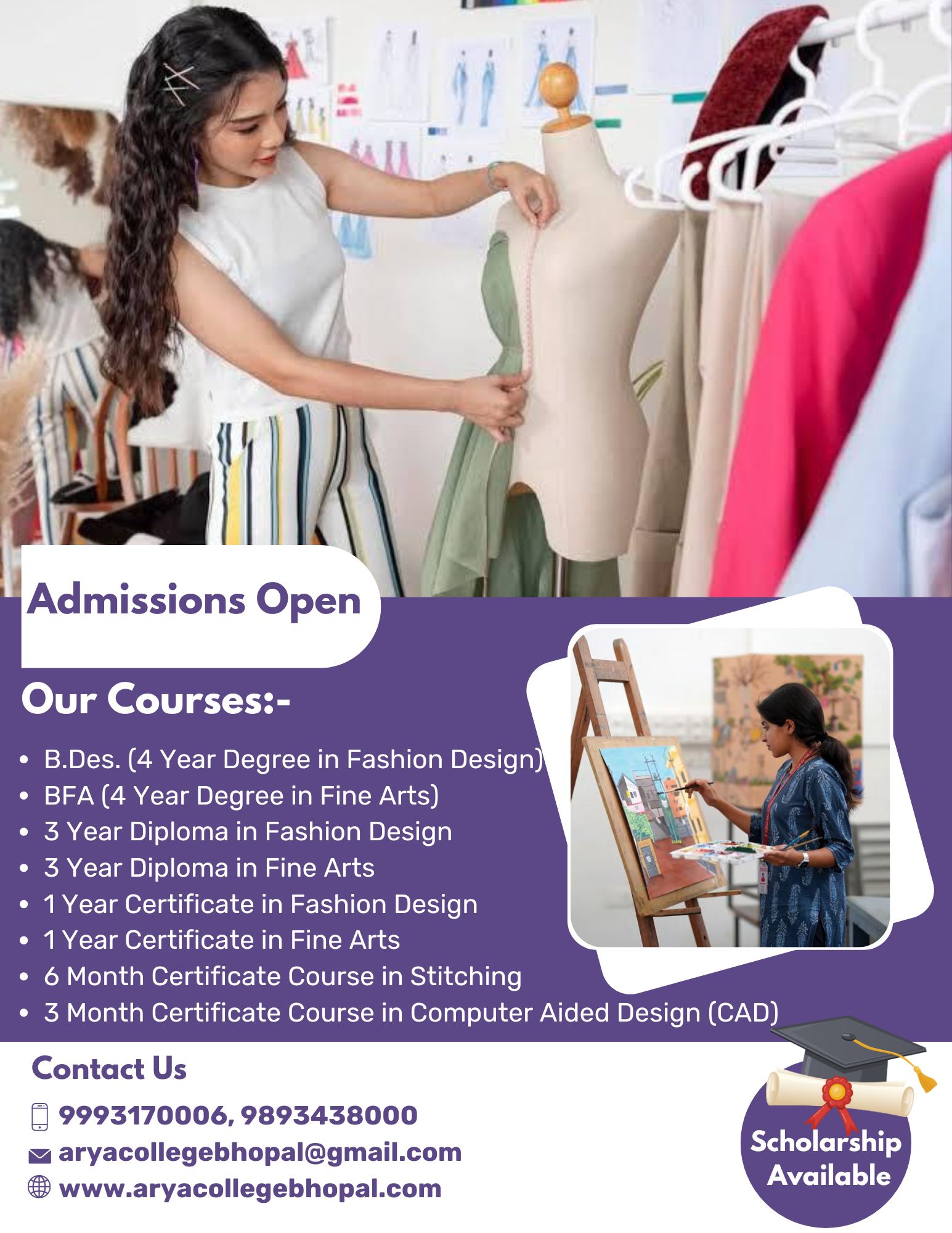 Arya College of Fashion Designing and Fine Arts is an institution located in heart of city of lakes, Bhopal (M.P.), established in 2015. It offers a range of undergraduate programs aimed at shaping well-rounded professionals in the field of Fashion Design and Fine Arts. The college emphasizes hands-on learning, industry alignment, and strong academic mentorship to ensure students achieve their career goals. Our college offers Bachelor's in Fashion Design and Fine Arts, along with diploma and certificate courses along with Smart classrooms, latest industrial machines and library.